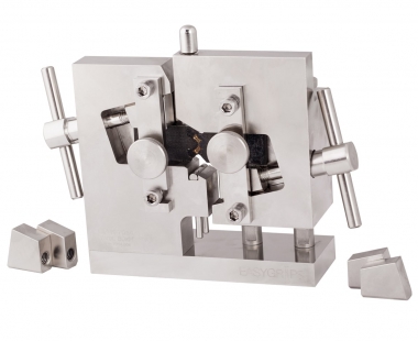 Для центровки образца и его выравнивая в плоскости оснастка оснащена специальным центрирующим устройством и прижимными винтами. Фиксация образца осуществляется с помощью клиновых вставок, которые затягиваются винтами с удобными барашками. Направляющие подвижной каретки оснащены стопорами, исключающими ее непроизвольное разъединение с основанием оснастки. Благодаря этому исключен вариант случайного падения тяжелого основания и повреждения элементов испытательной машины и травмирование персонала.